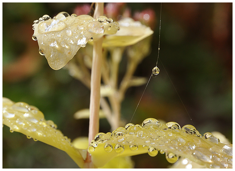 Pour moi il y a trop de gouttes. J'aurais évité de cadrer toute la partie gauche pour me concentrer sur la goutte suspendue et celles d'en dessous.