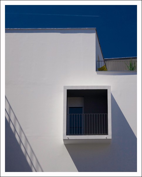 C'est simple, sobre, graphique. J'aime bien.Peut-être, pour moi, sans le dos du fauteuil(?) jaune. Et sans la traînée de l'avion dans le ciel, parce qu'elle n'est pas parallèle au bâtiment (je sais je suis rigide ). Mais avec la plante verte.