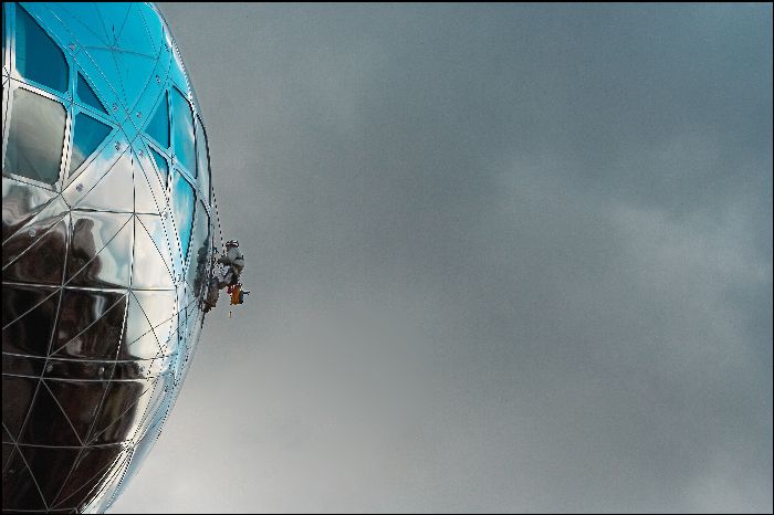 C'est l'Atomium à Bruxelles en Belgique pendant sa rénovation. Des alpinistes devaient placer ces énormes panneaux recouverts de miroirs et s'assurer de leurs bons ajustements. :-)