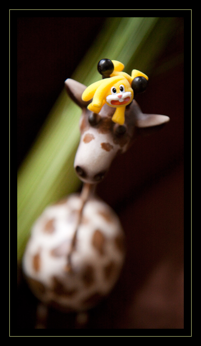 Pauvre lapin sur la tête d'une girafe, j'ai peur pour lui dans cette situation inconfortable ...et en plus ça penche !