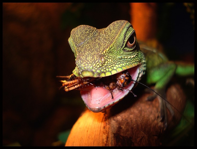 Belle macro ! J'aime bien le jeu entre l'oeil de la sauterelle qui se fait dévorée toute crue, et l'oeil de ce gros "lézard" menaçant et satisfait ! Bravo !