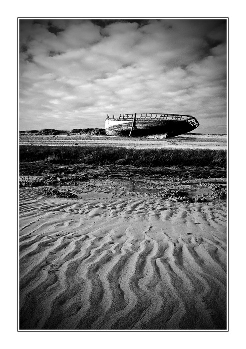 Je la trouve un tout petit peu "étroite", par rapport à l'épave, mais pour tout le reste c'est magnifique, la composition comme l'a dit Fotony, le NB superbe, le rendu du sable ....