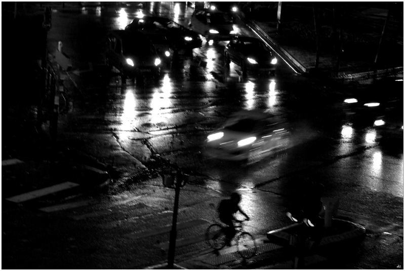 Ah j'adore! On ressent parfaitement toute cette agitation urbaine, les reflets parfaits et cette silouhette du cyclicte super bien placée... boite à CDC