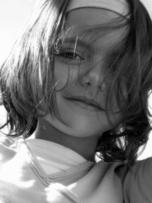 Le cadrage me plait bien, j'aurais peut-être coupé juste au-dessous du bandeau dans ses cheveux, pour donner plus de force à son regard et pour éliminer le triangle blanc dans le coin haut/droite. Certains blanc sont trop surex à mon avis, mais cela reste un tout premier portrait tout à fait correct.