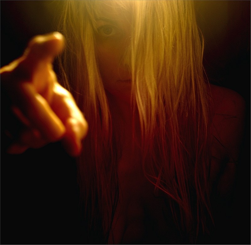 Bonne intensification du regard par la belle chevelure blonde qui cache une partie du visage.