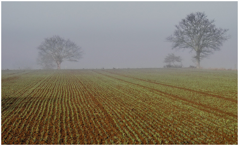 Belle ambiance de campagne un matin d'hiver. Son titre est très bien choisi car ce sont eux qui font tout le charme de cette photo.