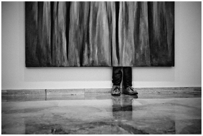 Très intrigant tout d'abord.. Ensuite, le traitement : NB + un côté peinture surtout sur le haut de l'image (pas sur le sol quoi) + les reflets du sol (un peu découpés à la façon cubiste) ..