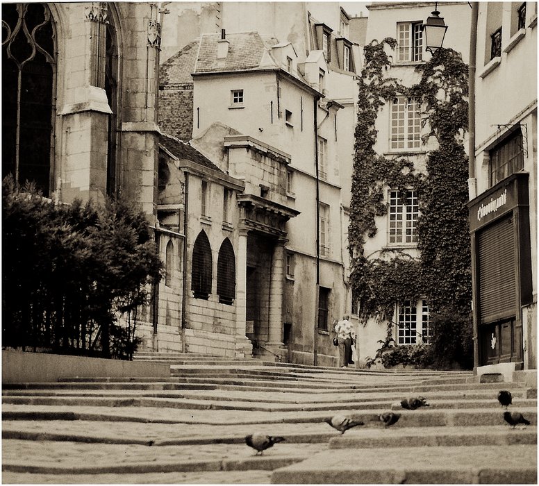 Beau coup d'oeil parisien. J'aime bien cette architecture religieuse faisant partie intégrante de la vie du quartier : les murs se touchent. Tout une signification.