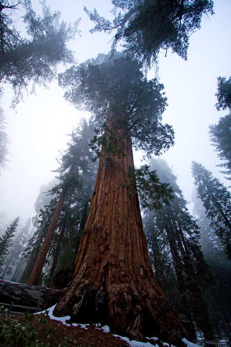 Bon angle de prise de vue qui, allié au personnage, témoigne bien du gigantisme de l'arbre.