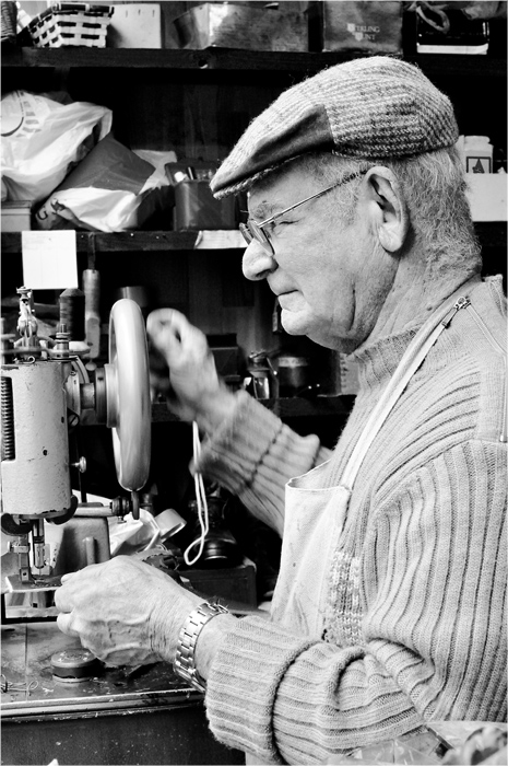 Pour explication, il est à ce moment là en train de coudre avec sa machine (non-électrique!!!) en regardant par la vitrine de sa boutique