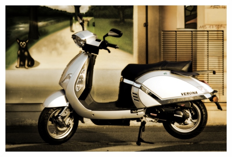 As-tu essayé de trouver un angle de cadrage pour 'asseoir' le chien sur la selle du scooter ?!...