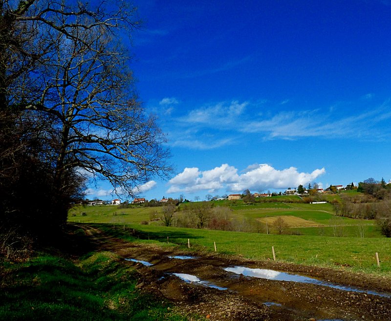 Pour moi, le paysage se suffit à lui-même, avec le regard qui zigzague du petit chemein aux maisons sur la crête, en passant par les prés et vergers.