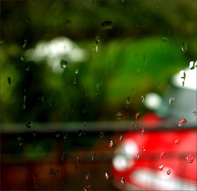 en couleur, la pluie est déjà si triste et avec le vert ça fait ressortir le rouge de la Mini.
