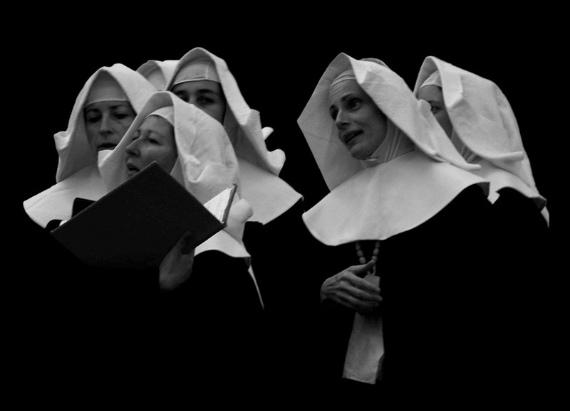 Ce recueil qui est tenu par le Saint Esprit ainsi (soit-il) fait toute la valeur de ce cliché, au début je le trouvait incongru mais non justement, il a toute sa raison. et les regards des religieuses du coup donnent tout le sel de ce cliché, Bravo!!