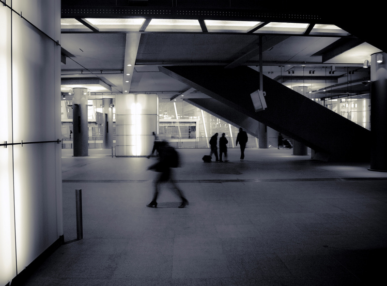 Extra ! j'adore cette silhouette pressée de quitter ce monde sous-terrain de néons et bardages métalliques.. vers.. je l'espère, celui où il y a des arbres, de l'herbe, des paquerettes