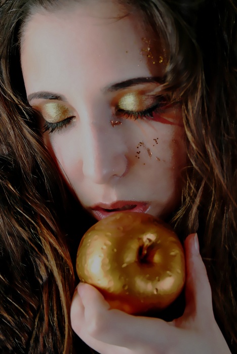 La retouche est beaucoup trop visible, surtout au niveau de la main, on dirait que tu n'as plus de doigt, la pomme est trop lisse, comme tes yeux et tes sourcils .. le maquillage a l'air assez beau je pense que cette photo ne nécessite pas autant de retouche