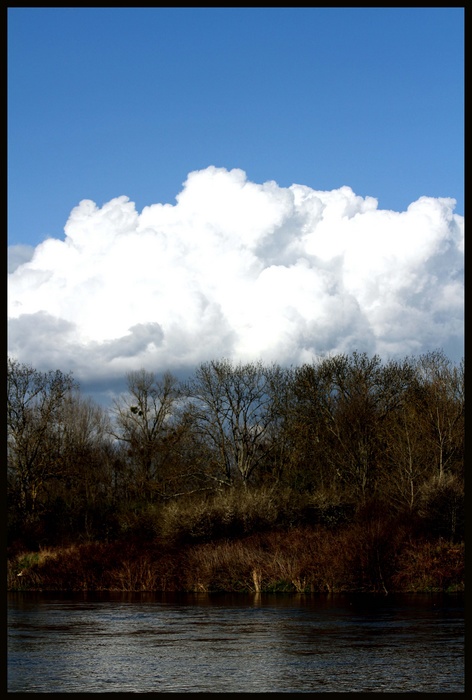 en fait dans cette photo, il y a les deux bandes du bas assez sereines mais sous la menace, la bande de nuage qui va désordonner cette sérénité et le bleu si paisible. bravo