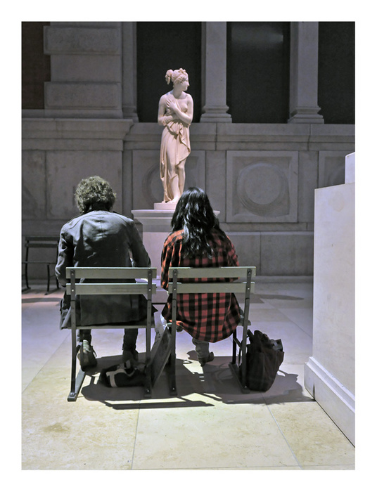 j'aime les couleurs et voir des gens de dos révèle toujours une atmosphère mystérieuse. on aimerait contourner la photo. le socle à droite est peut-être en trop.