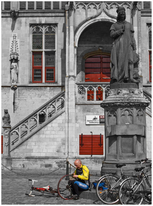 moi j'accroche. contraste solennité du lieu et "emmerdement" du cycliste. N&B du monument (d'ailleurs juste un petit dommage pour les huisseries colorées qui n'apportent pas gd-chose ) et couleurs criardes du bonhomme grandeur de la statue, petitesse du monsieur.