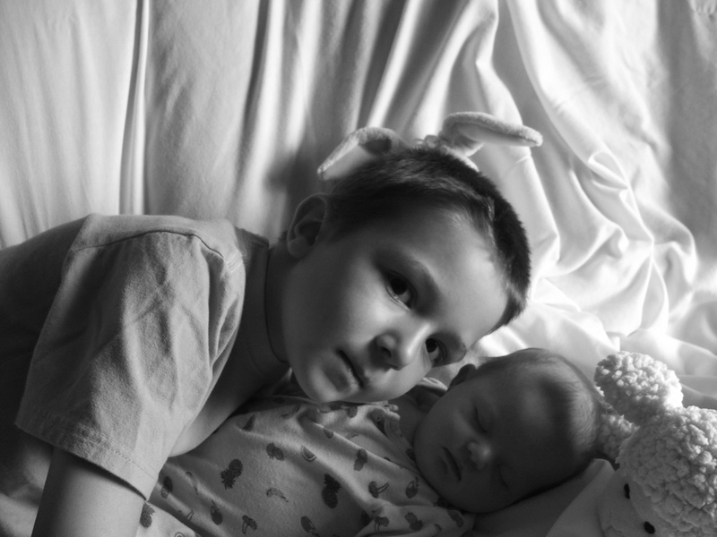 -faire plus attention au cadrage : ici en bas c'est un peu coupé violemment (bébé, bras du garçon et peluche sont coupées un peu fort pour moi), la peluche qui fait des oreilles de lapin au garçon est de trop, le cadrage du garçon est trop centré : sa tête est pile au centre de ta photo.