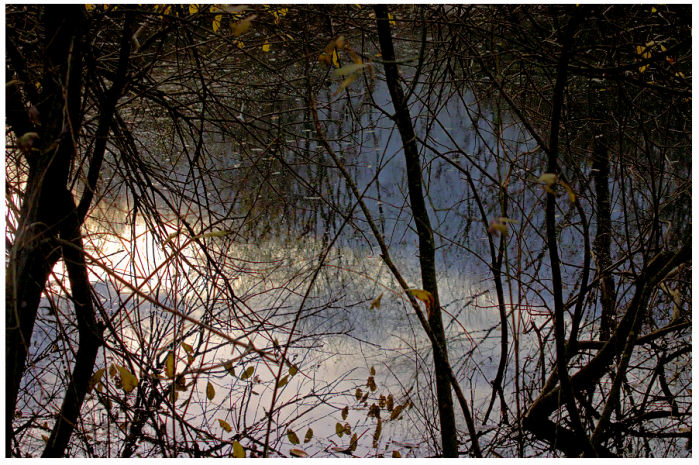 J'aime beaucoup ces taches de jaune qui contrastent avec les couleurs plus ternes sur l'étang, luminosité parfaite pour moi. L'encadrement de branchages est très réussi, on reste accroché!