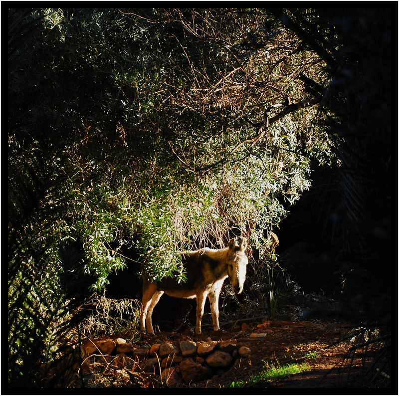 Au cours d'une balade matinale dans une oasis, j'ai rencontré cet âne esseulé, immobile et silencieux dans cette lumière du matin, à demi caché par la végétation...Pas vraiment habitué à photographier du "bétail" mais j'ai été séduit par cet espèce de clair obscur qui l'entourait et par sa présence...Voila