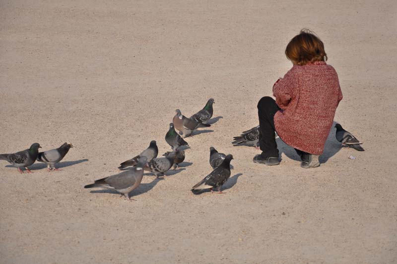 On dirait que la petite à peur de l'arrivée de tous ces pigeons.