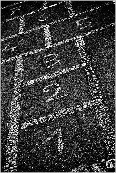 Le traitement très dur de la photo reflète mal la légèreté du jeu de la marelle (les riantes écolières sautant gaiement à cloche-pied.