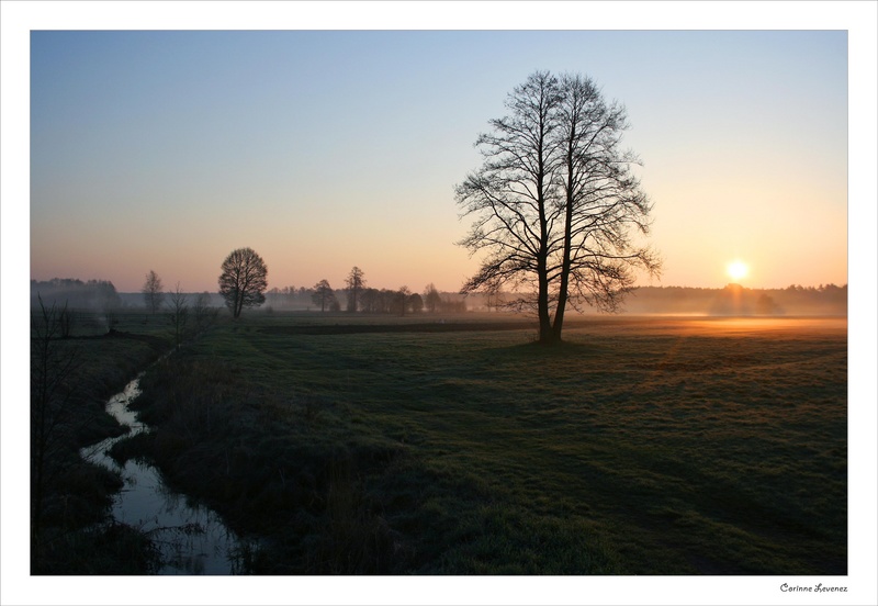 Diffile, l'oeil est attiré par le ruisseau qui ne le mène que sur un fond secondaire, alors qu'à l'opposé, il y a ce bel arbre el le lever de soleil. Le regard est divisé en 2.