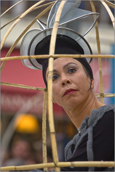 Il s'agit d'un spectacle de rue sur les femmes dans tous leurs états. Ici la femme encagée et cantonnée aux travaux ménagers dans un déni de toute vie personnelle. J'ai trouvé le parallèles intéressant d'avec la Burka, invisible pour celle-ci mais bien présente.