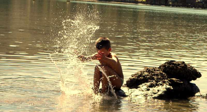 C'est vrai que la bande de rivage en haut est un peu gênante mais ce qui perturbe surtout ma lecture de cette jolie photo, ce sont ces rochers noirs et imposants qui écrasent un peu le gamin...