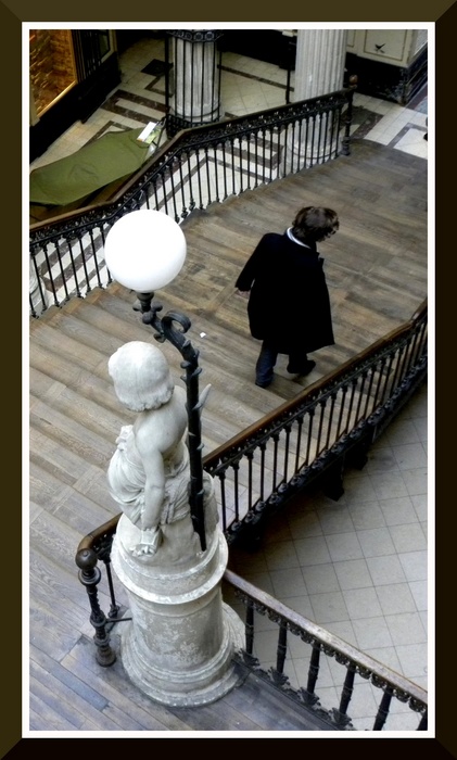 Belle idée mais le problème, c'est que le personnage qui descend l'escalier et qui est le vrai sujet de la photo est 'écrasé' par le chérubin, son piédestal et le lampadaire...