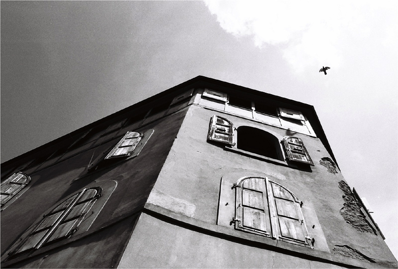 La photo est très dynamique, on dirait que le bâtiment va gober l'oiseau.