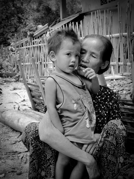 Photo prise dans un village laotien, c est une grand mere avec son petit fils...
