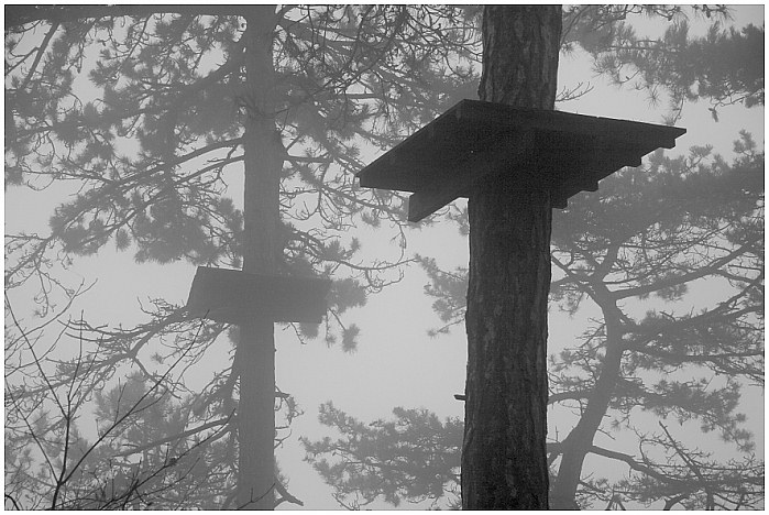 J'aime bien la composition et l'ambiance mystérieuse, mais le premier tronc a un rendu bizarre, surtout au niveau de la plate-forme, je ne parviens pas à trouver les mots pour décrire cela