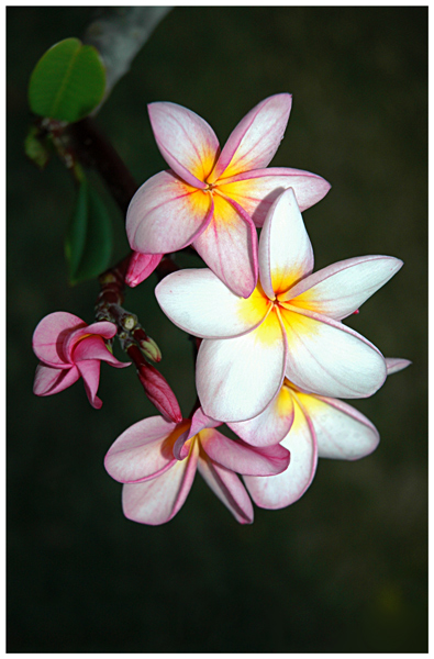 Beaucoup de douceur sur cette branche de frangipanier qui descend comme une offrande; le dégradé de gris du fond fait ressortit très délicatement ces fleurs, une très belle photo à emporter dans ces rêves pour la nuit!