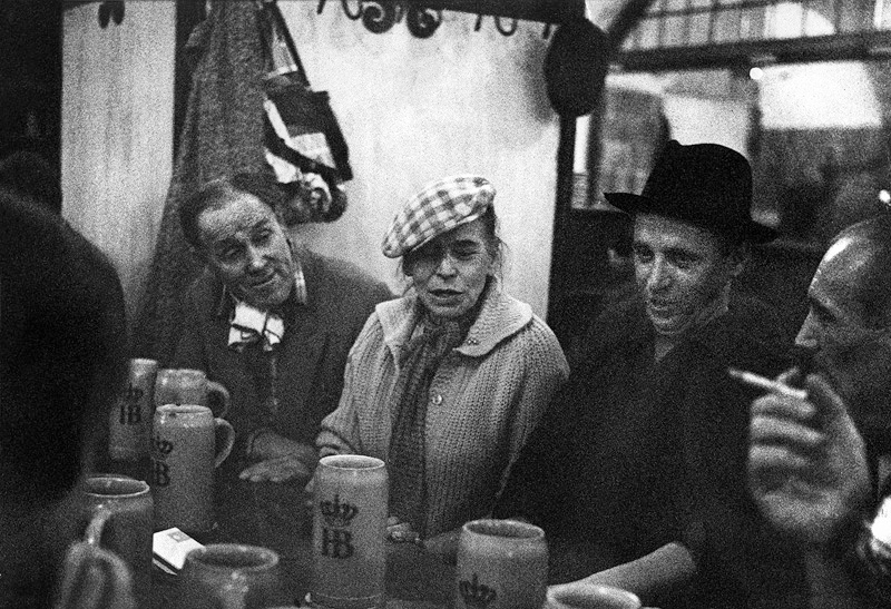 Cave à bière de Munich. Je n'ai pas résisté à la tentation de ressortir cette photo à l'ancienne, réalisée sur film Trix-X 120 poussé à 3200 ISO et retravaillée au renforçateur ce qui lui donne cette granulation typée d'une grande netteté. On n'aime ou on n'aime pas, mais la grand mère à casquette au centre était trop craquante.