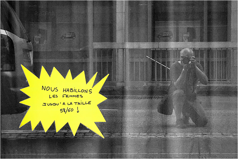 Un peu léger comme sujet pour moi, la voiture est peut-être de trop et ton reflet n'a pas un grand rapport avec la pancarte : si une femme corpulente passait dans la rue ou au contraire une femme très mince ça pourrait ajouter une pointe d'humour.
