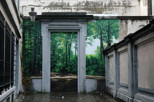Ambiance étrange d'une maison oubliée dont la porte vide donne sur un jardin perdu....Sympa....