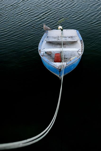 Angle de pdv original avec un joli dégradé de noir qui fait bien ressortir la corde et dirige le regard vers le canot