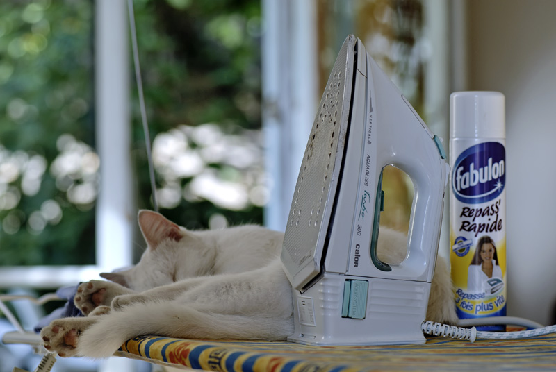 Pour moi, il y a trop d'éléments sur la planche à repasser et le chat est à peine visible. Un autre angle de vue l'aurait peut être fait davantage ressortir.