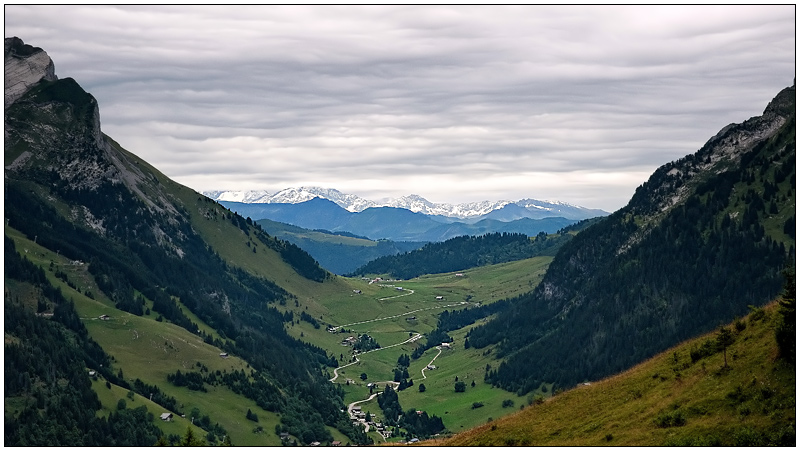 Je la trouve très belle cette vue de la vallée avec les montagnes qui barrent l'horizon. Il y a cependant un voile on dirait qui me gêne et perturbe un peu les couleurs je crois.