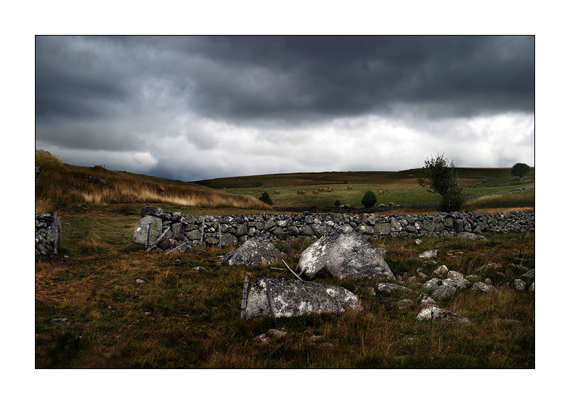 Superbe ce plateau qui me fait penser à l'Aubrac, la Lozère, tous ces coins là...Un ciel sombre à souhait, l'orage qui menace, l'odeur du foin coupé...Belle image