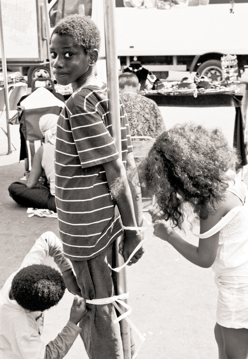 regard sympa du gamin attaché par ces camarades attachants