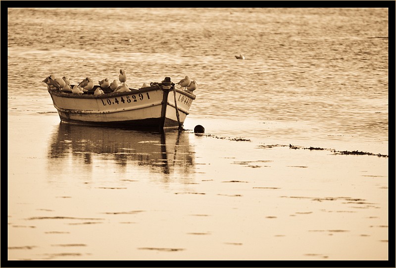Moi elle me plait cette photo, cette barque solitaire chargée d'oiseau ça me parle. Et cette lumière me convient bien, bon cadrage et beau traitement.