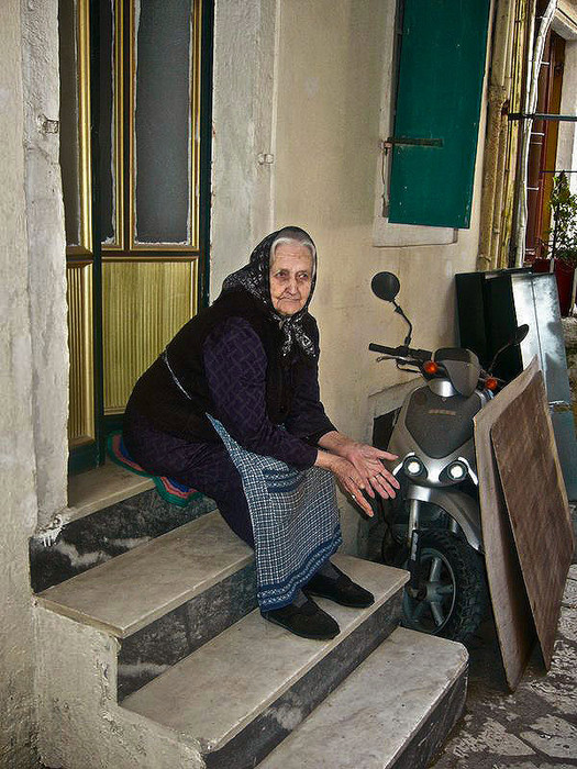 Moi je la trouve plutôt sympa et très caricatural cette grand mère assise sur son pas de porte dans un environnement montrant un certain choc de culture.