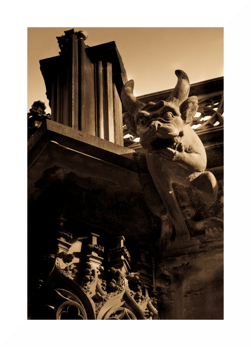 je préfère tes deux précédentes versions, celle-ci me semble un peu trop chargée; les éléments en arrière de la gargouille se confondent un peu avec ton sujet. Peut-être une profondeur de champ plus réduite et/ou un peu plus d'espace sur la droite et au sommet auraient été bénéfique