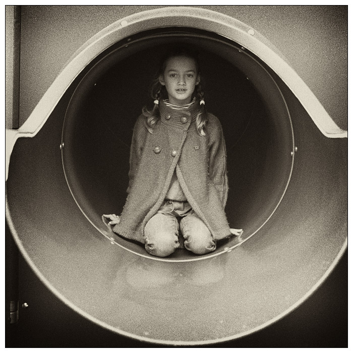 L'idée de la photo m'est venu quand je l'ai vu sortir de ce toboggan avec sa veste un peu retro et ça m'a fait pensé à certains décors des année 70-80, à la fois graphique mais qui sont maintenant très datée. On y reviens d'ailleurs dans la déco. Je l'ai tout de suite vu en carré mais n'ayant pas mon moyen format avec moi, j'ai pris celui que j'avais en bandoulière, mon vieux Nikon FE.