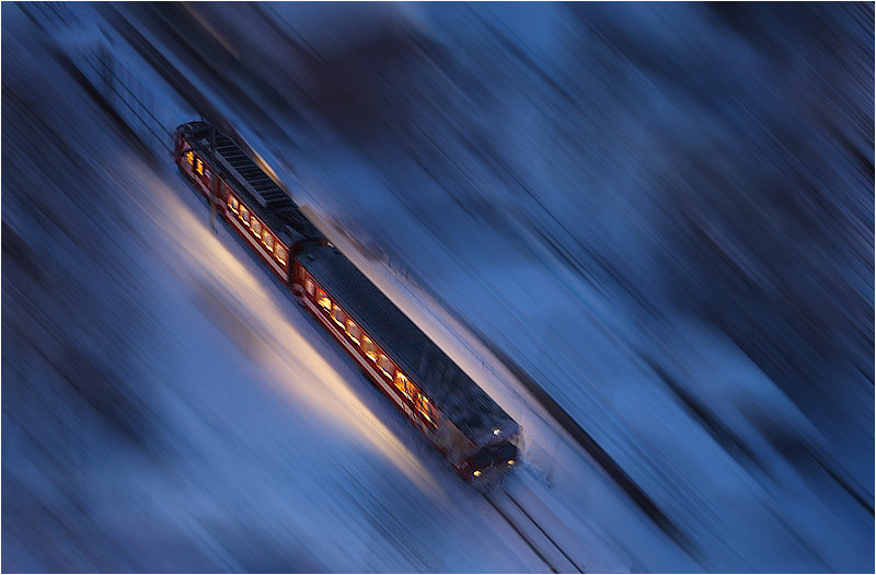 très réussi! j'adore le contraste entre la chaude et rassurante lumière du train avec le froid ambiant donné par la teinte bleutée de la neige! Le flouté rend très bien l'impression de vitesse. Comme une capsule de vie traversant à toute allure un environnement hostile où il ne ferait pas bon s'attarder. En ce qui me concerne, je trouve la composition parfaite telle qu'elle est là.