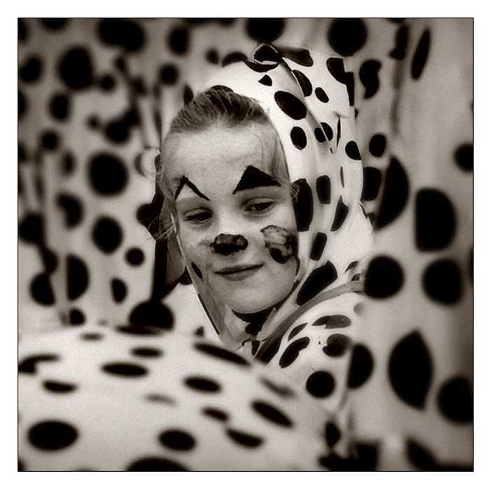 PdC bien gérée, format carré bien adapté, expression de la jeune fille bien saisie comme surprise et amusée dans ce monde canin.